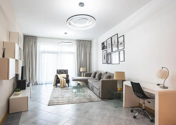 The spacious 87 m² Elegant 1-Bdr With Panoramic Marina & Canal Views Dubai apartment lies merely 1.6 km from Roxy Cinema JBR and nearly 10 minutes' walk from DAMAC Properties tube station. The apartment with a terrace is located in proximity to the Dubai Water Canal.